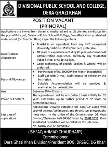 Only male candidates can apply for these Divisional Public School And College Jobs In DGK August 2025. Qualification /Experience Required:MA/M.Sc or equivalent from any HEC-recognized University/Institute. M.Phil/Ph.D are preferable 10 years of experience including 05 years of educational administration experience, preferably any residential Public School or Cadet College Good proficiency of English (Spoken & writing) will be preferred., more experienced candidates should apply before 20 August 2025.