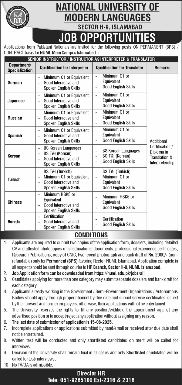The last date to apply for this job is 15th August 2025.HR Branch Sector H-9 NUML Islamabad Jobs August 2025 Advertisement