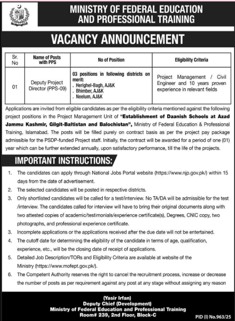 Candidates, if you are seeking the Ministry Of Federal Education Jobs In Kashmir August 2025 if yes. It would be best if you tried to complete read this Ministry Of Federal Education job because you can easily apply for these vacancies Deputy Project Director (PPS-09).