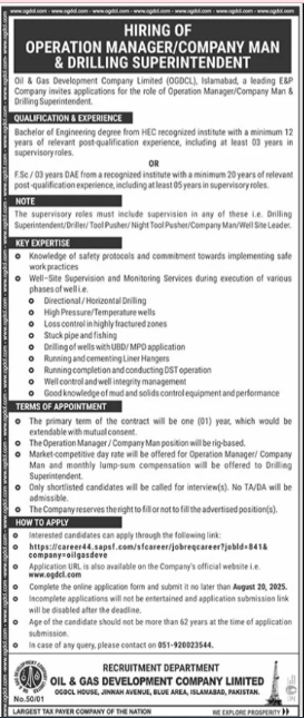 The last date to apply for this job is 20th August 2025.Oil Gas Development Company Jobs In Islamabad August 2025 Advertisement