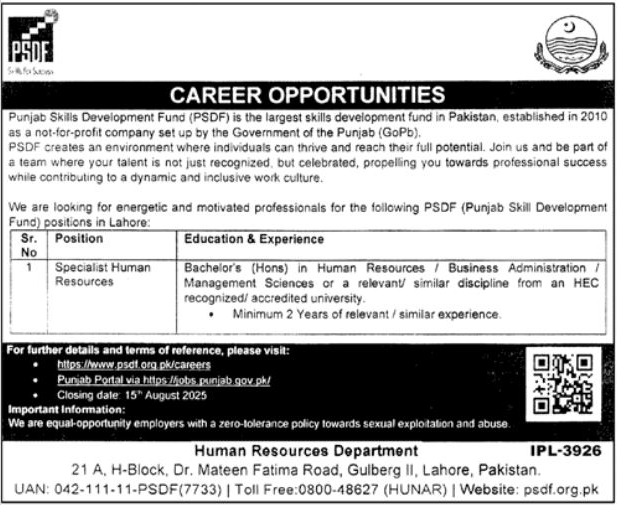 Only male candidates can apply for this Punjab Skills Development Fund Jobs In Lahore August 2025 Qualification /Experience Required: Bachelor’s (Hons) in Human Resources/ Business Administration/ Management Sciences or a relevant similar discipline from an HEC recognized/ accredited university Minimum 2 Years of relevant/similar experience and more experienced candidates should apply before 15 August 2025.