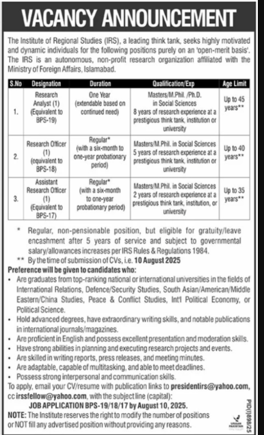 Candidates if you are seeking the Karachi Shipyard & Engineering Works Limited Jobs In Karachi August 2025 if yes. It would be best if you tried to complete read this Institution Of Regional Studies job because you can easily apply for these vacancies Research Analyst (1) (Equivalent to BPS-19) Research Officer (1) (equivalent to BPS-18) Assistant Research Officer (1) (Equivalent to BPS-17).